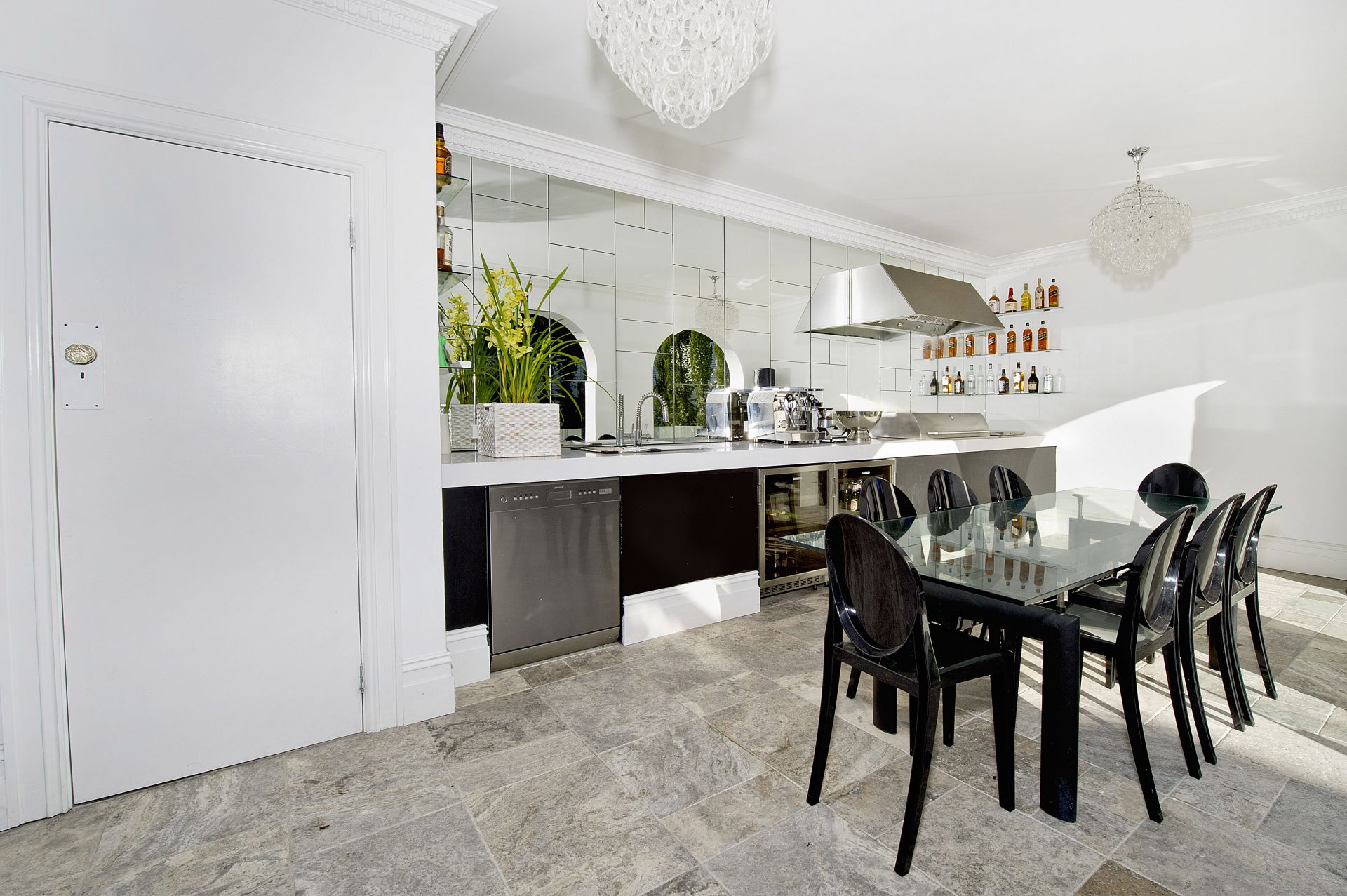 - Chic travertine bathrooms, guest powder room, bespoke joinery