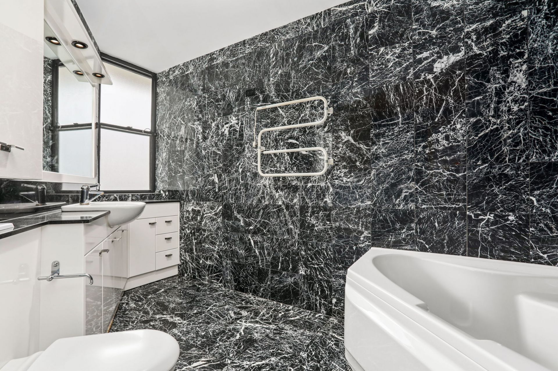 Two bathrooms, the main with corner spa bath, black marble tiling and twin basins and toilet. Endless storage, Separate internal laundry.