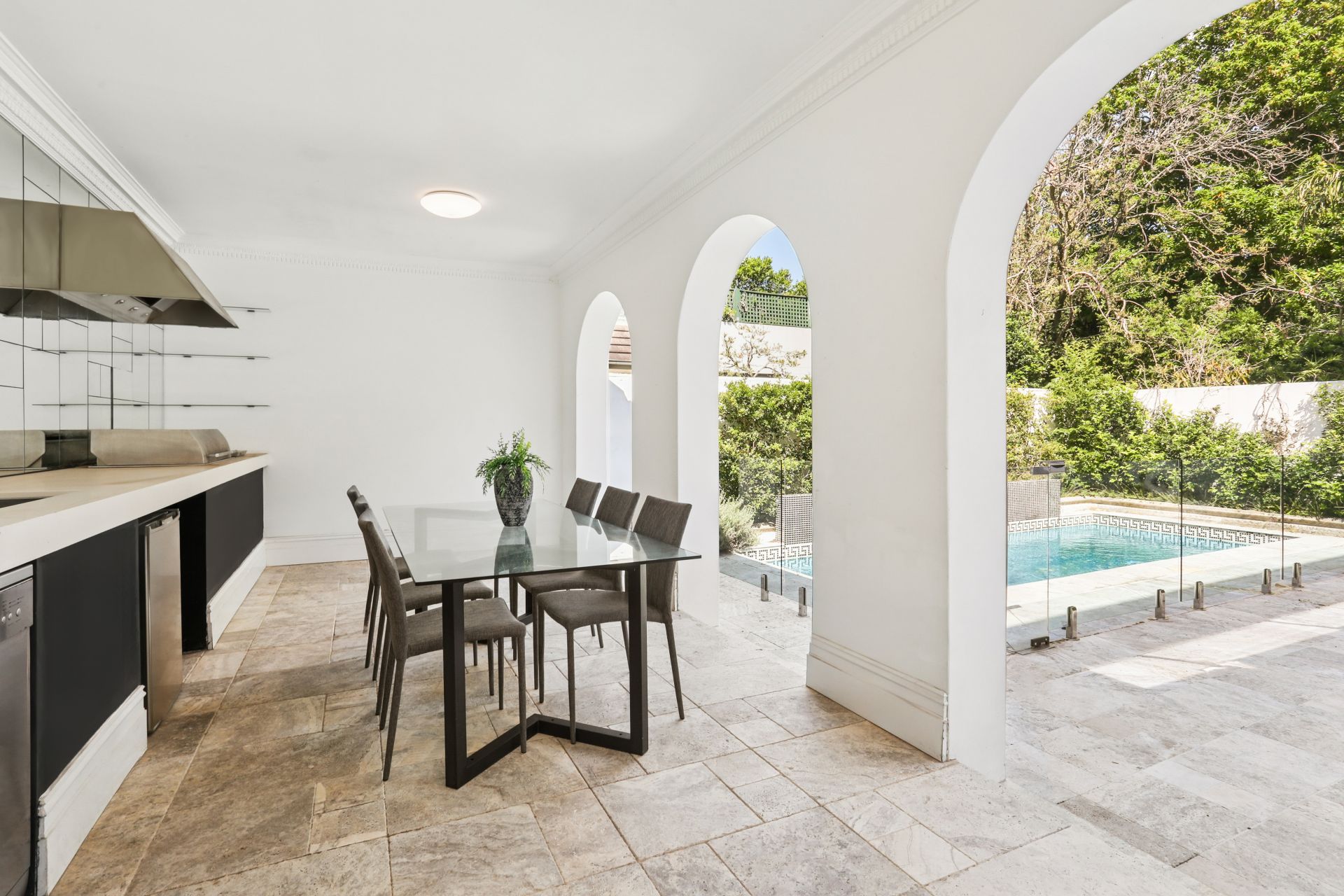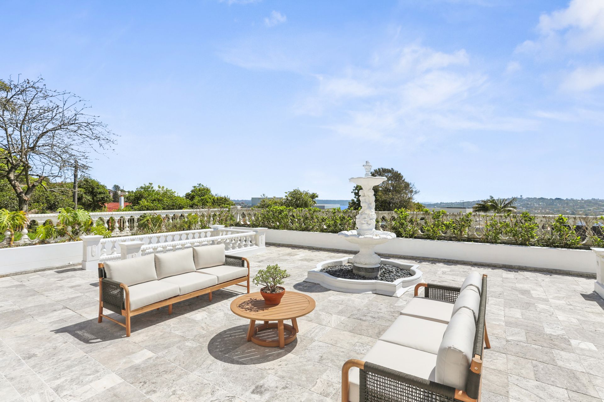 - Expansive travertine entertaining area with a pavilion and outdoor kitchen, as well as grand entertainers terrace with views