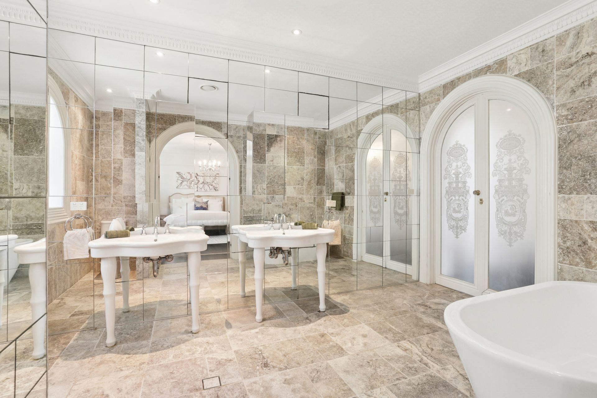 - Four oversized travertine and mirror bathrooms and 3 guest powder rooms