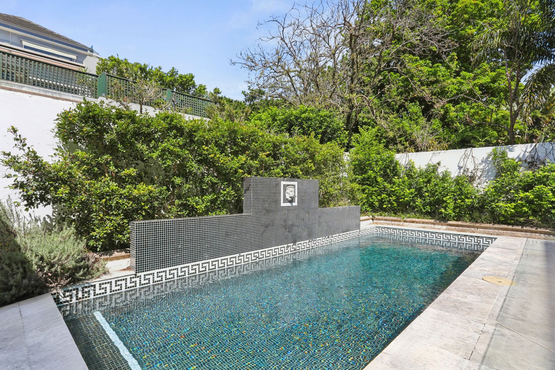 - Heated mosaic-tiled pool, private home theatre, and dedicated gym/yoga space