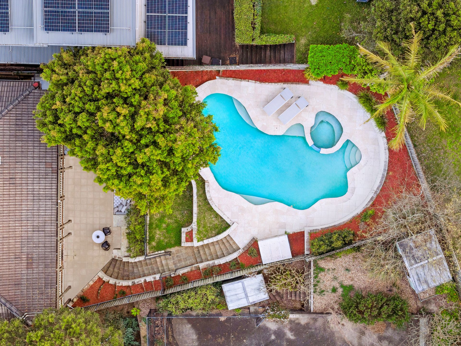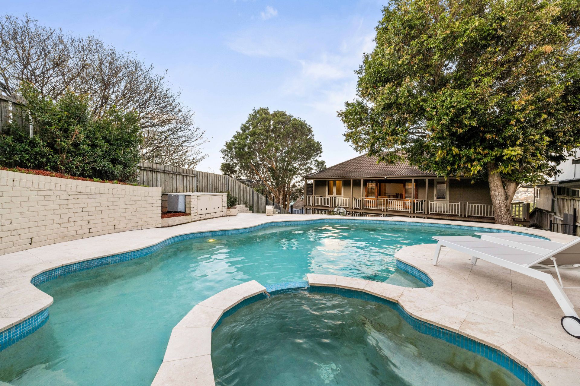 - Resort-style backyard features an elevated swimming pool and spa