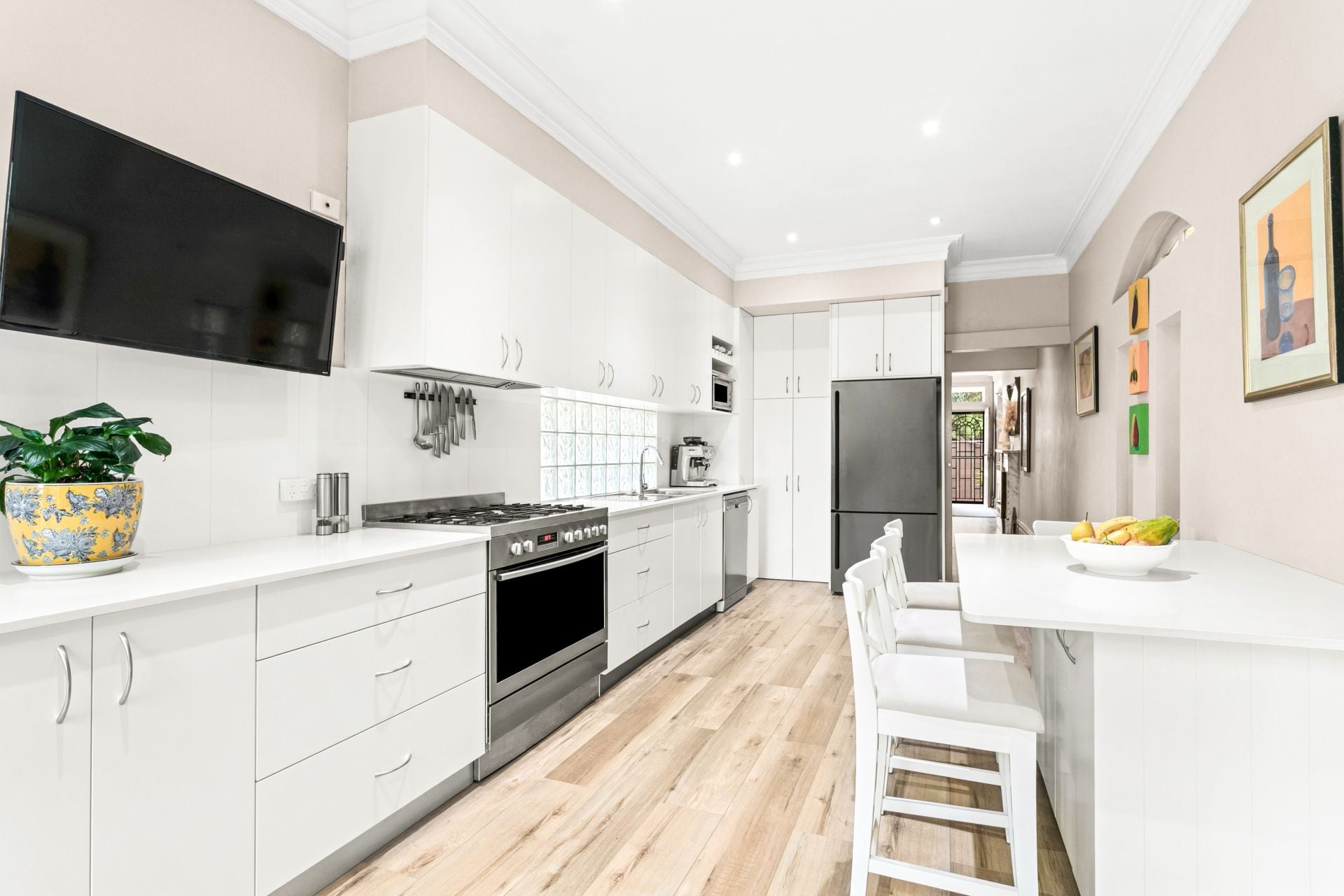 • Modern gas kitchen with stone benchtops & mobile island