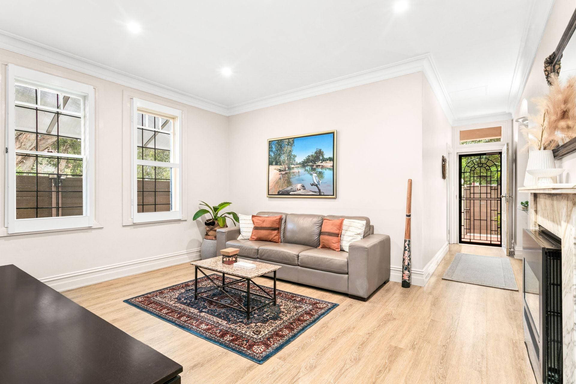 • Light-filled living area with Arabescato marble fireplace
