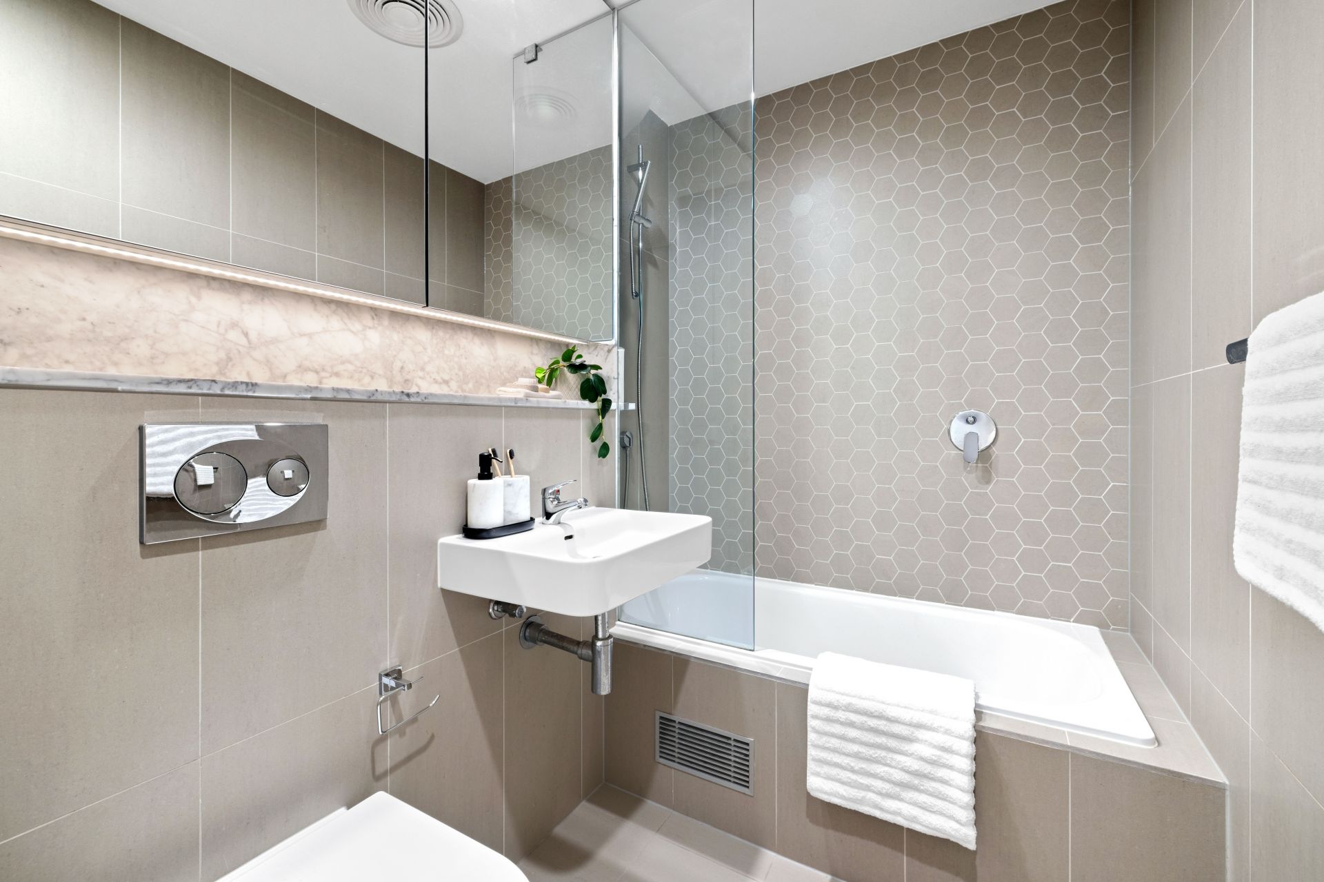 - Contemporary bathrooms with stone and marble detailing, laundry