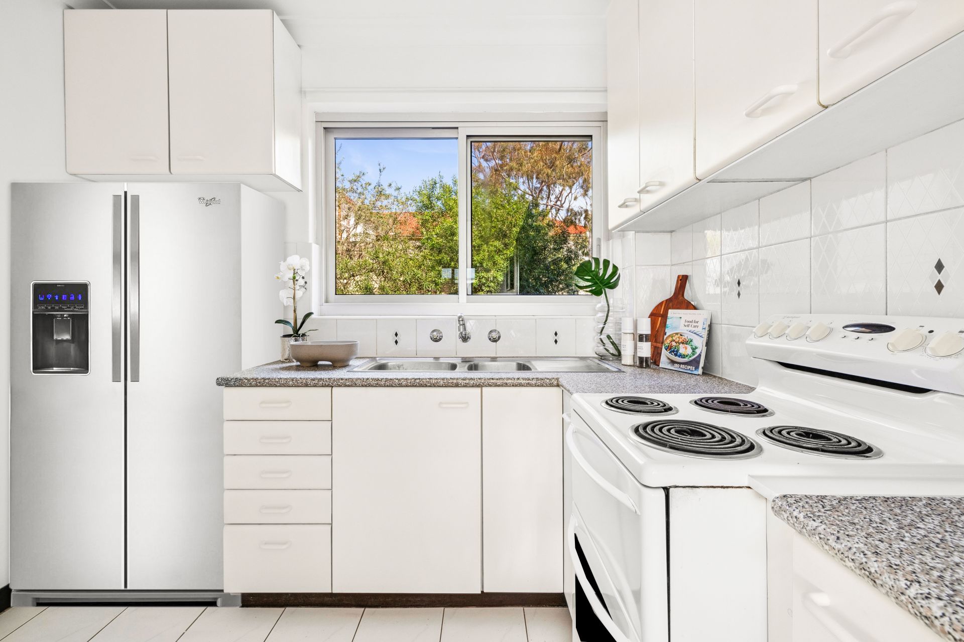 • Neat kitchen with electric cooktop, ample storage and a leafy outlook
