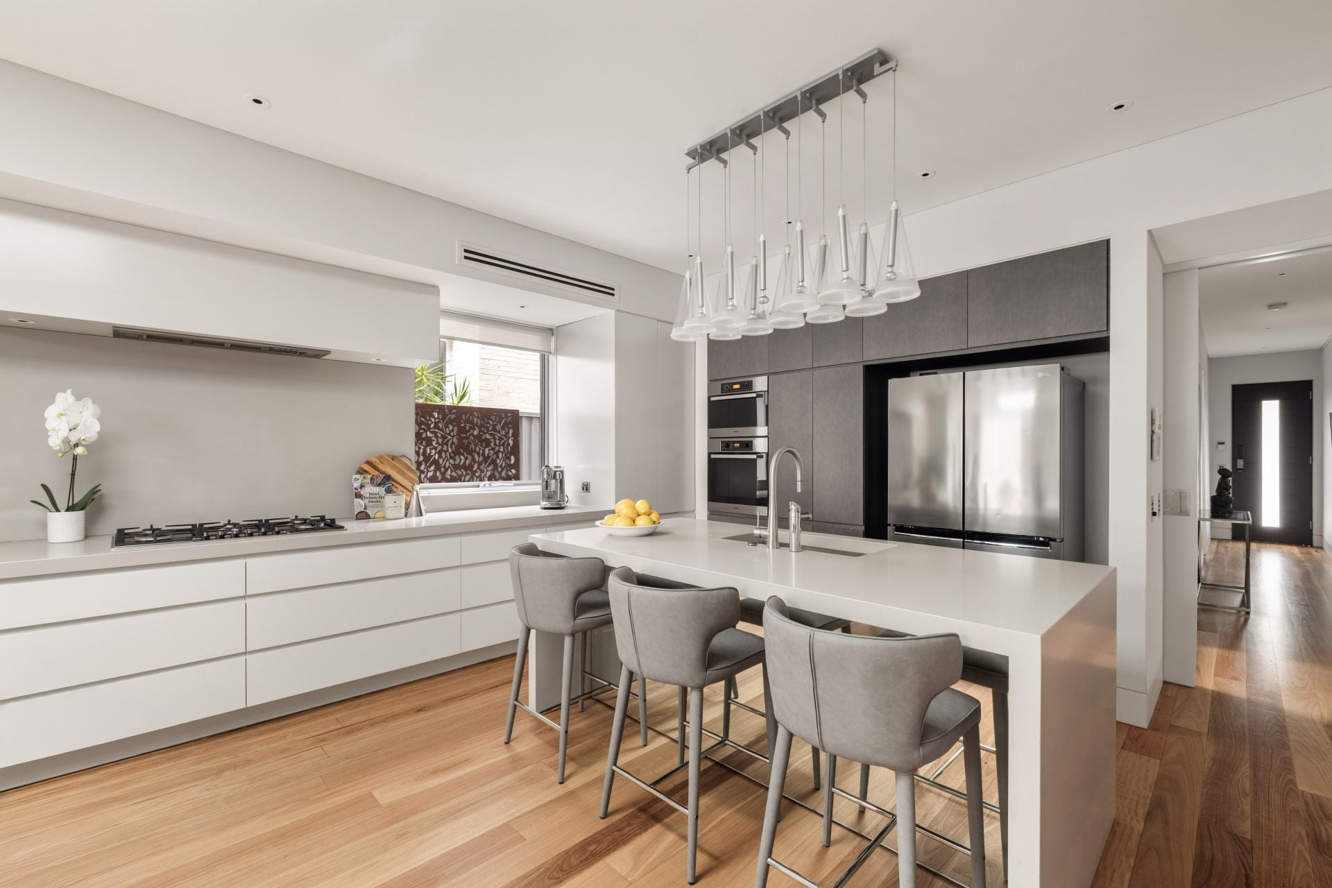 Designed for seamless indoor-outdoor living and entertaining, the home showcases bespoke designer interiors featuring a sun-drenched neutral palette, refined marble detailing, natural timber flooring and skylights that invite natural light to cascade throughout the residence.At the heart of the home, a gourmet island kitchen has been appointed with an exceptional suite of premium appliances, including a Miele gas cooktop, Zip Hydrotap, Insinkerator, and wine fridge, creating an inviting space for family and social gatherings. Flowing living and dining zones transition effortlessly to a private north-facing entertainers' sanctuary, complete with a custom stainless-steel outdoor kitchen crafted for year-round hosting, framed by sunshine and coastal ambience.