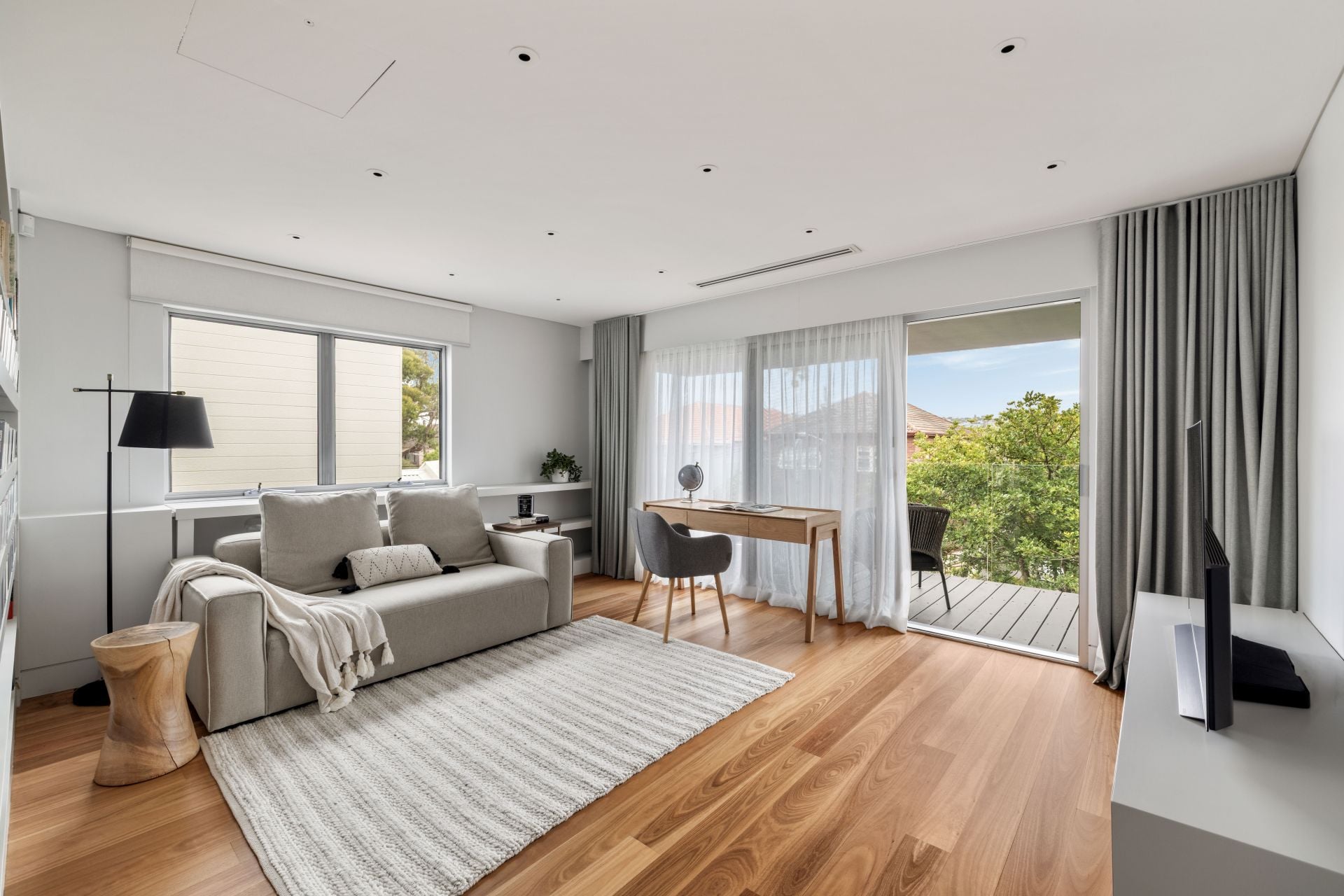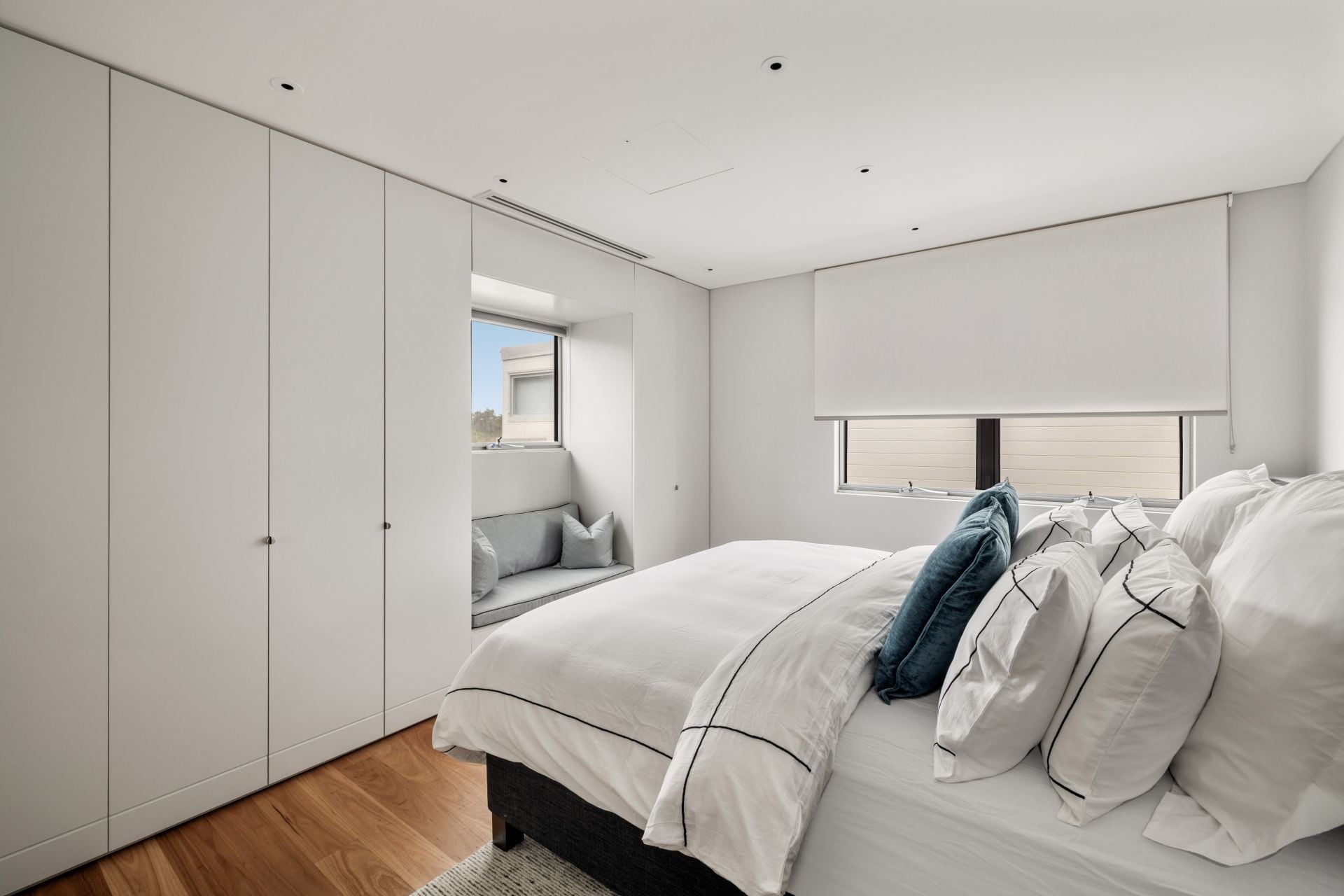 The residence accommodates four generously scaled bedrooms, all featuring customised built-in wardrobes. The oversized upper-level master bedroom enjoys custom joinery, direct access to a peaceful sunlit balcony and is large enough to double as another living area.