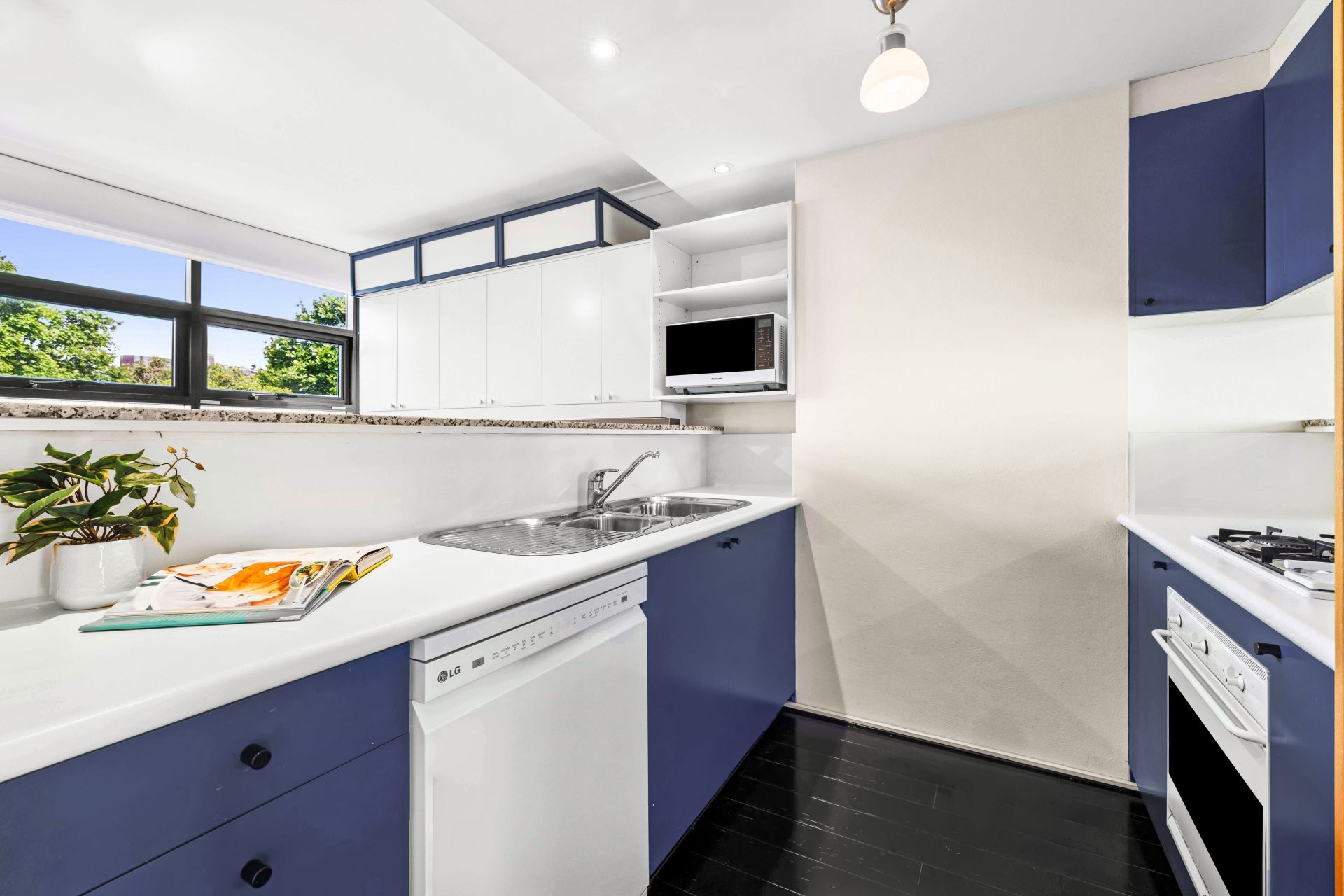 - Streamlined kitchen, gas cooking, dishwasher, ample storage