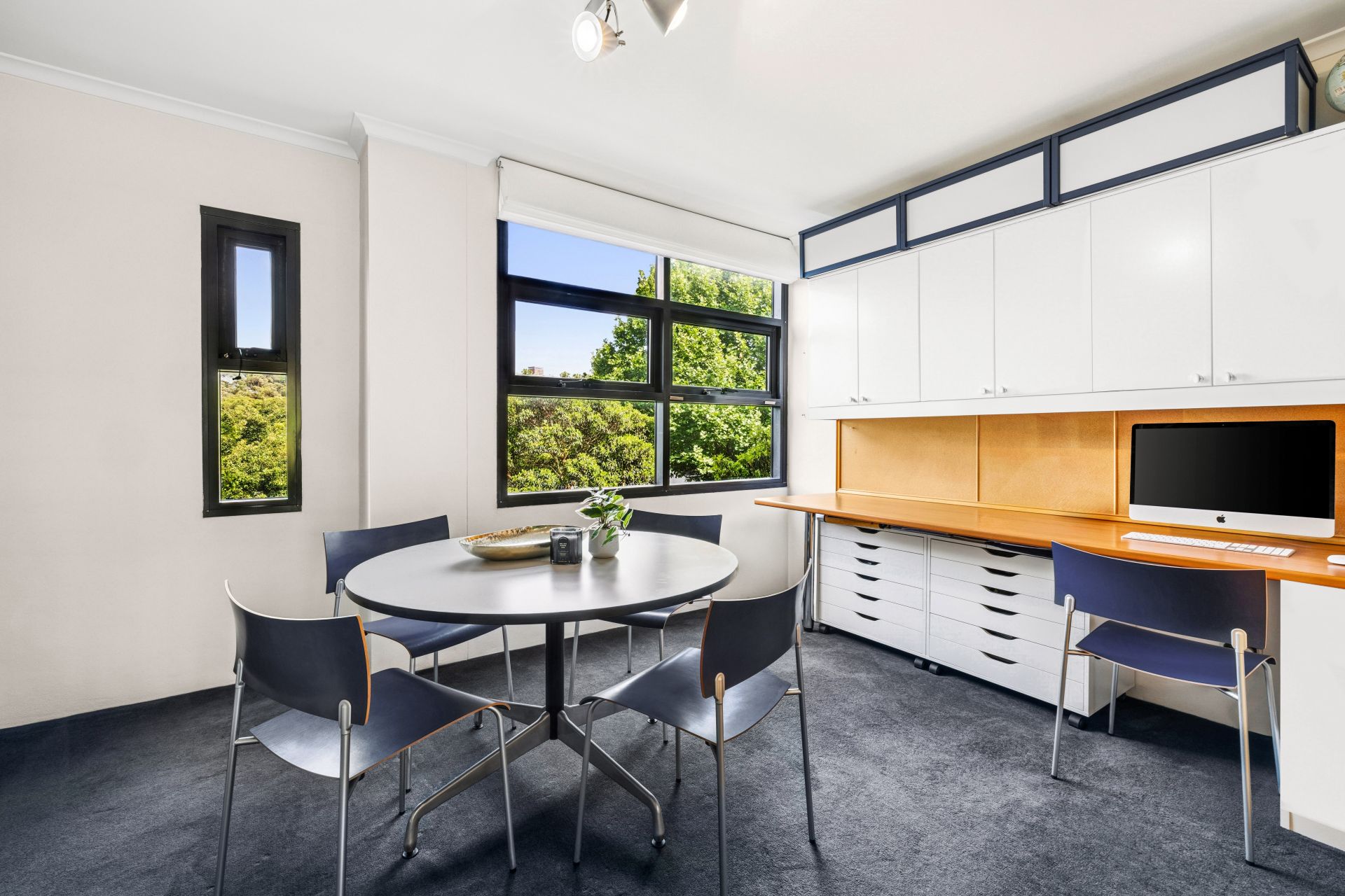 - Window-lit study zone with built-in desk, custom joinery