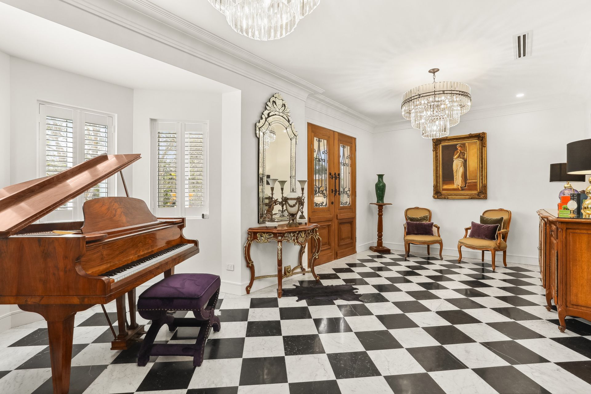 - Grand foyer with double entry doors and exquisite crystal chandeliers