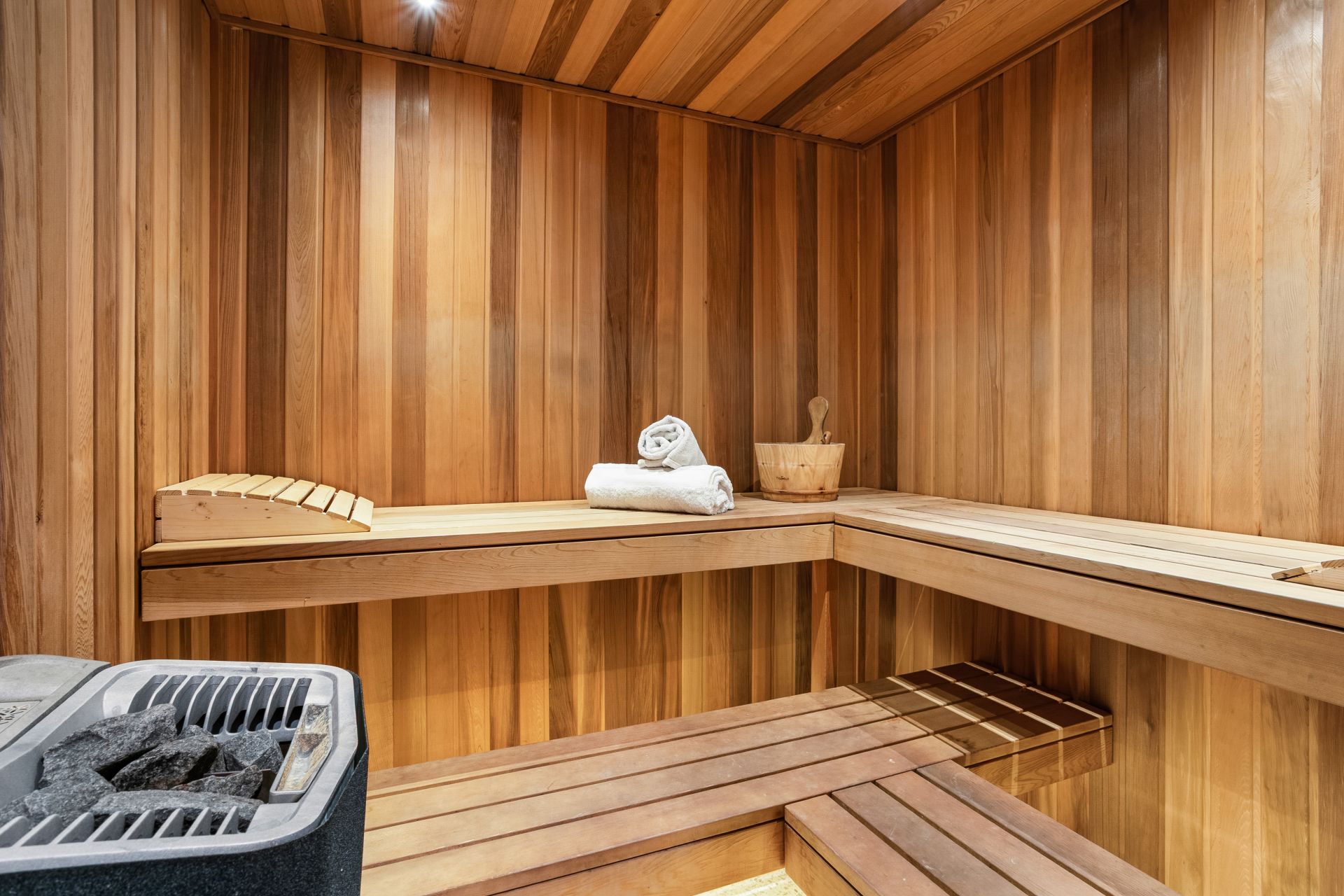 - Heated pool, spa, sauna, full-size gym